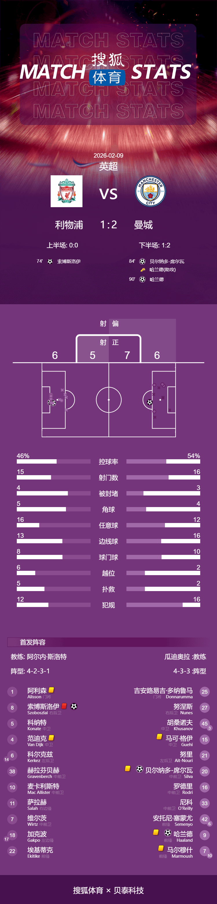 北京时间2月9日凌晨0时30分,2025-26赛季英超联赛第25轮焦点战在安菲尔德球场展开角逐,曼城客场2-1逆转10人应战的利物浦,取得近4个联赛客场首胜,在英超积分榜上继续排在第二位,落后榜首阿森纳6分;利物浦连续8个主场不败纪录被终结,在英超积分榜上排在第六位,落后前四5分。索博斯洛伊第74分钟任意球破门,哈兰德第84分钟助攻B席扳平比分,此后挪威神锋补时第3分钟罚进点球锁定胜局。此外,谢尔基最后时刻进球被吹,索博斯洛伊被红牌罚下。
